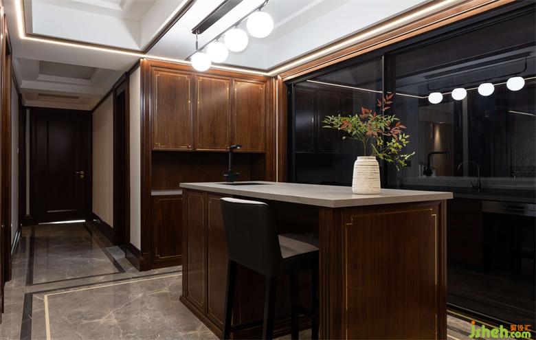 餐廳高端的美克A.R.T.實(shí)木圓形餐桌,家居設(shè)計(jì)通過與地面的平花大規(guī)格地磚,深淺色調(diào)的配色,表達(dá)出不同材質(zhì)融合的魅力,使得每個(gè)家具獨(dú)立而不孤立。頂墻酒水柜使用高端胡桃木的實(shí)木柜,兼具裝飾、收納的職能,內(nèi)嵌的裝飾畫及裝飾品,彰顯主人輕奢的生活品味和格調(diào)。