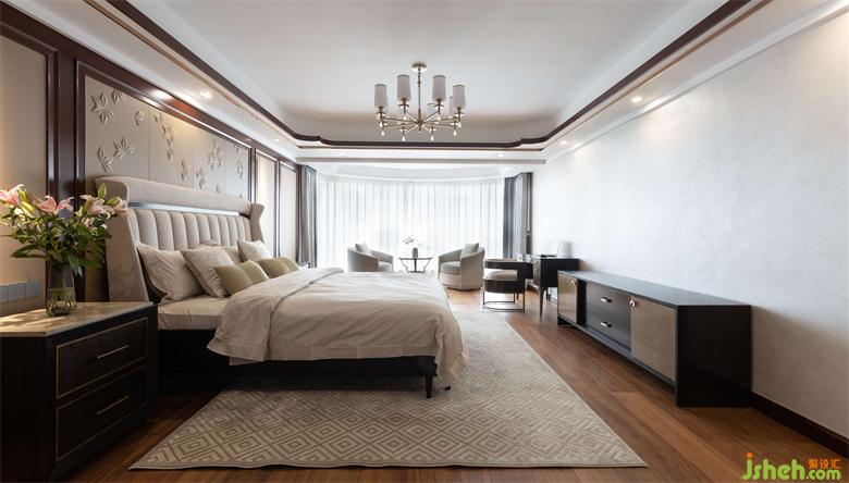 主臥整體色系給人一個(gè)溫馨的空間,墻面大面積采取藝術(shù)漆、背景墻主體設(shè)計(jì)胡桃木護(hù)墻板,家居設(shè)計(jì)配合著現(xiàn)代感的淺色硬包,為整體空間奠定了簡約時(shí)尚的格調(diào)。奢適的性能、精細(xì)的工藝,營造出大氣舒適氛圍的主人房。