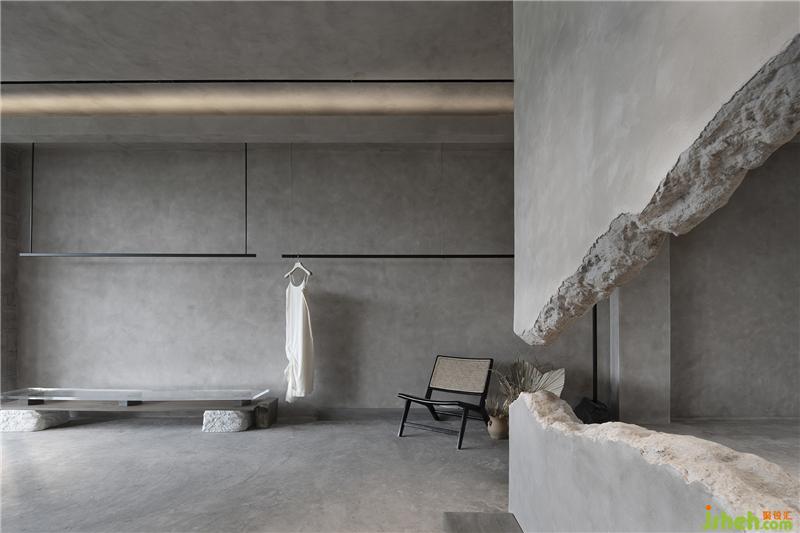 設(shè)計師很在意時間跟空間的對話關(guān)系,空間中用到的各種材質(zhì)和設(shè)計手法,不僅僅像在表達對空間的探索,更像是在我們朝著未知未來的猜測,對物質(zhì)存在的虛擬構(gòu)想。原木、水泥、金屬和洞石這些形象材質(zhì),將會成為老化的媒介物品,它們并不只是在懷舊,還是時空游走于過去和未來之間。