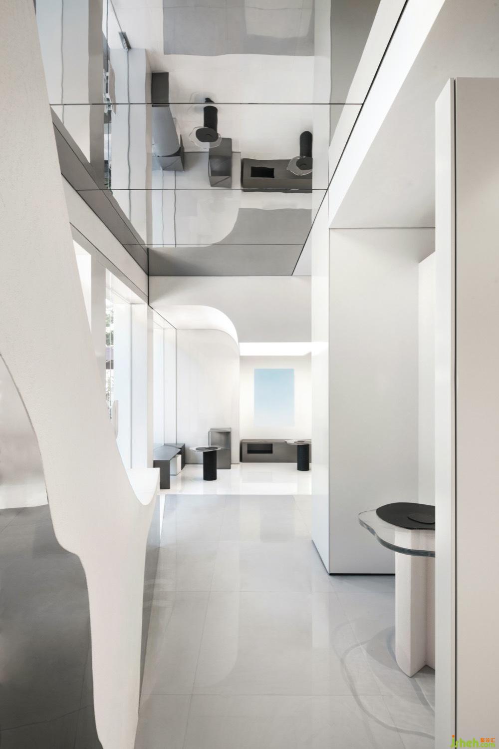 于屋外看,一個(gè)朦朧的引人探究的白色盒子安靜地佇立著,每一個(gè)試圖探索霧中光境的旅人因步步接觸與走近而得到了答案和共鳴,不停地?fù)荛_(kāi)迷霧,靠近光源,探索虛幻的維度,直到他們能夠趕得上,碰得見(jiàn)。室內(nèi)設(shè)計(jì)師