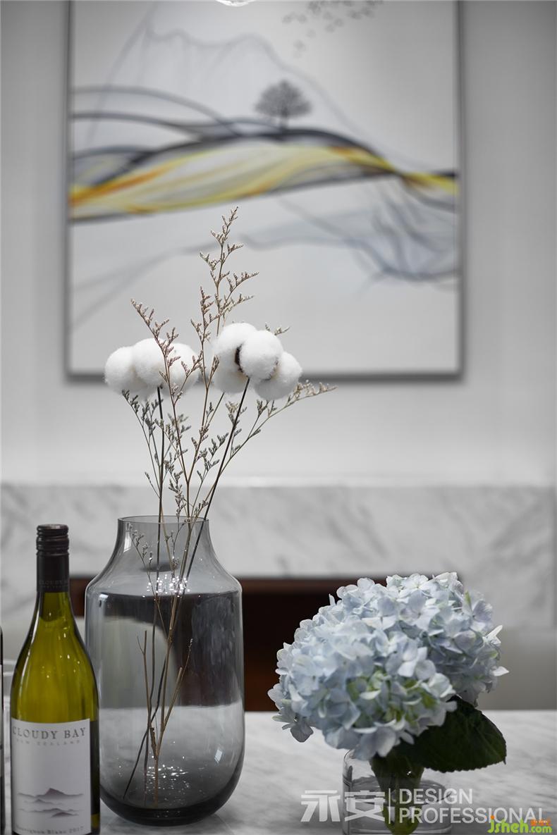 穿過(guò)玄關(guān)進(jìn)入一個(gè)干凈利落的空間,定制的深色多功能金屬架與整個(gè)氛圍相輔相成,賦予空間獨(dú)特的魅力??筒蛷d一覽無(wú)余,客餐廳合二為一,復(fù)古雕花、石膏角線(xiàn),古典與現(xiàn)代的巧妙碰撞,藝術(shù)和抽象的軟裝造型為空間帶來(lái)極具張力的感覺(jué),現(xiàn)代時(shí)尚風(fēng)格與細(xì)膩的藝術(shù)氣息的植入,使空間特質(zhì)既滿(mǎn)足了現(xiàn)代創(chuàng)新的審美訴求,又有古典的優(yōu)雅,散發(fā)陣陣詩(shī)意和濃郁的現(xiàn)代人文氣息,于形與意、態(tài)與勢(shì)之間展露出沉穩(wěn)的貴族風(fēng)范。藝術(shù)漆鋪就墻面,形成空間流暢連續(xù)的過(guò)渡。色彩鮮明的藝術(shù)畫(huà)帶來(lái)精神世界的營(yíng)養(yǎng)供給,沙發(fā)線(xiàn)條利落,塑造大氣沉穩(wěn)風(fēng)范。