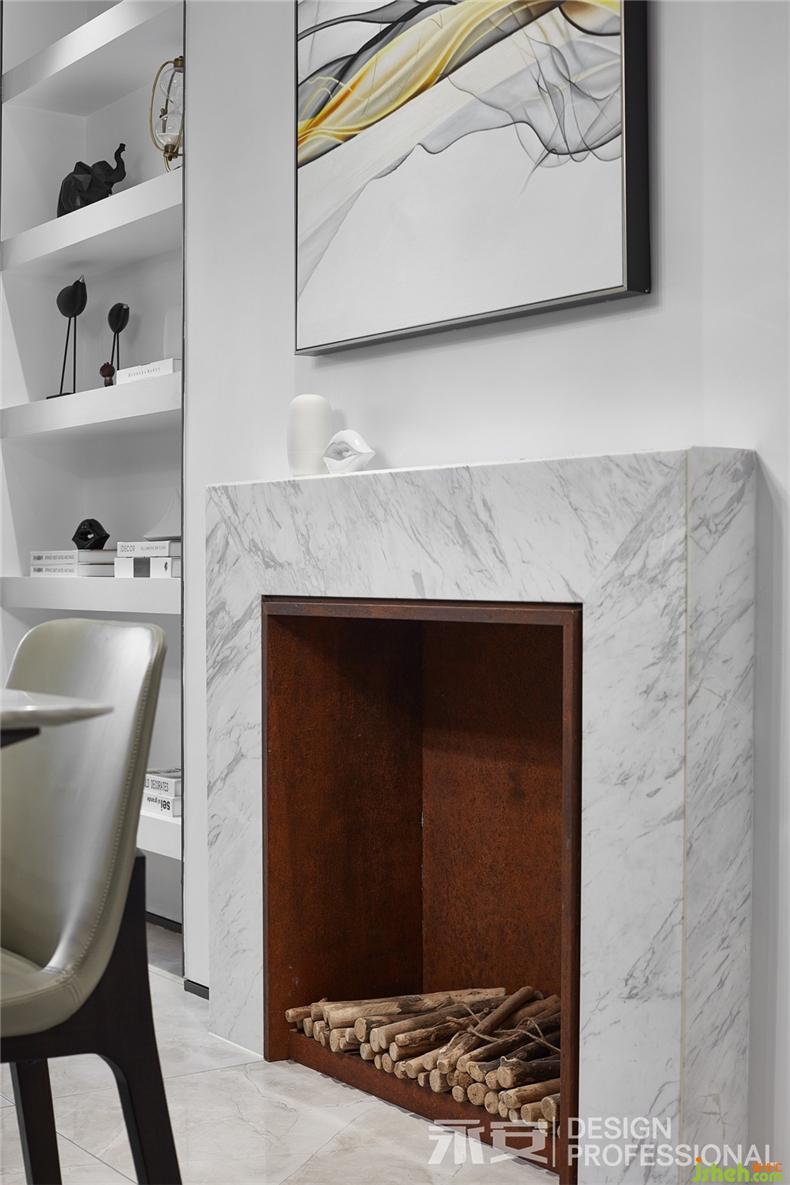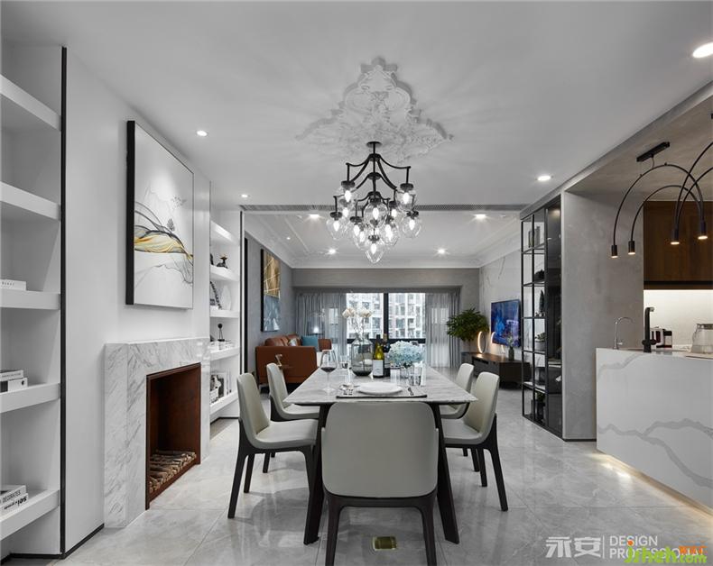 餐飲除了是生活必備部分以外更是一種交際和情感交流的區(qū)域,因此設(shè)計(jì)師對(duì)整體布局做了大的調(diào)整,不論是客餐廳還是休閑空間的布局都得到了釋放,而且還增加了島臺(tái)區(qū)域空間分配了中西餐櫥。室內(nèi)設(shè)計(jì)師被得以釋放的空間更是得到了最好光照亮度和視線(xiàn)景色。餐廳配以石膏雕花、頂燈是一個(gè)錯(cuò)落的橢圓形燈組,雕花、燈桿和燈珠恰恰處于餐桌中間點(diǎn),十分巧妙。傳統(tǒng)壁爐的演繹變化,它與書(shū)柜形成了良好的互動(dòng),為生活增添了許多審美的元素,增加了生活樂(lè)趣。裝修公司