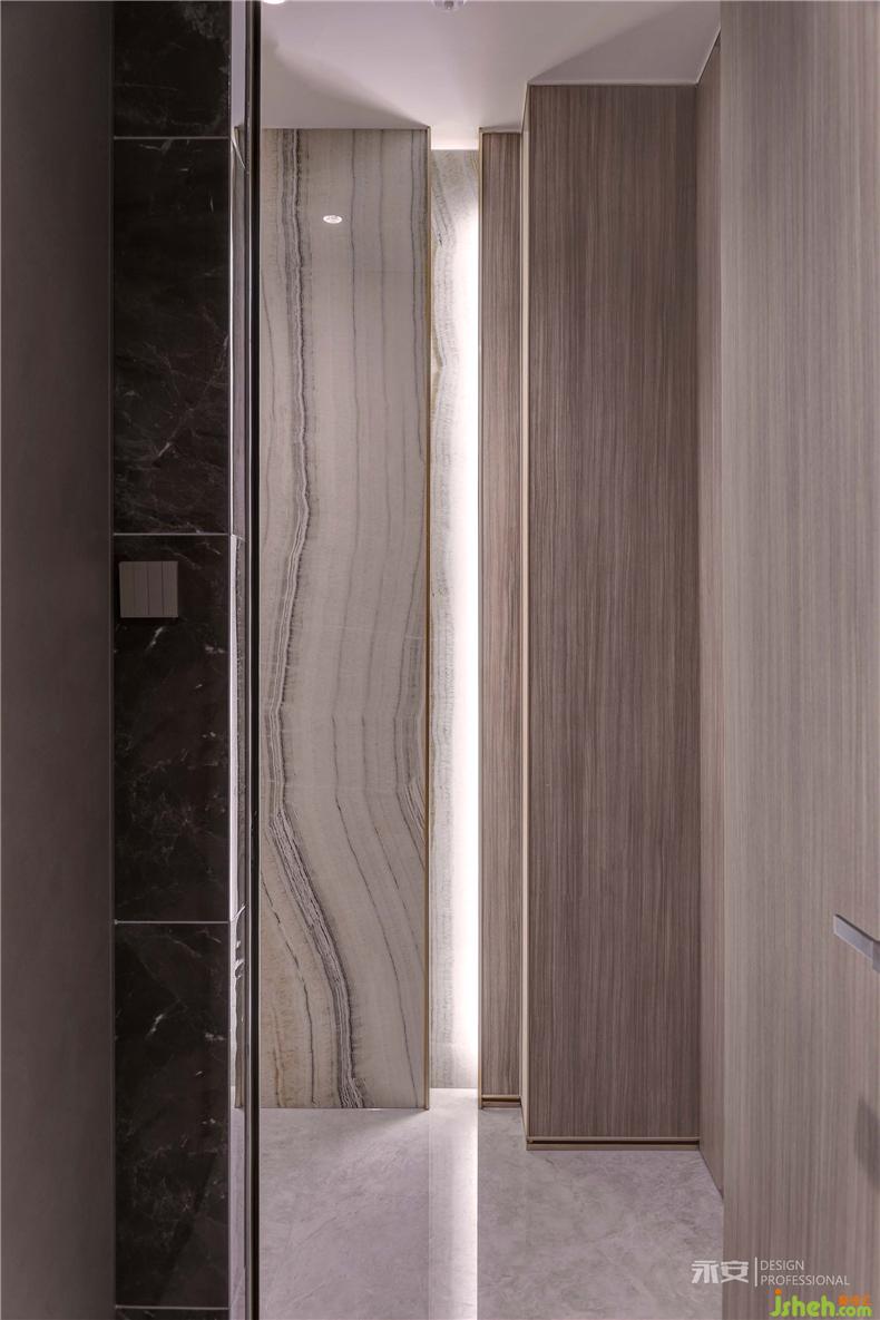 客廳靠陽(yáng)臺(tái)一側(cè)的房門通往主臥,外部飾面在燈光的漫反射效果下,猶如孔雀開屏一般熠熠生輝,大氣的結(jié)構(gòu)與細(xì)膩的工藝在視覺上給人以夢(mèng)幻般的藝術(shù)美感。左側(cè)承重墻上設(shè)計(jì)師別具匠心地使用了與房門一致的貝殼馬賽克飾面,搭配門環(huán)與之形成“母子門”的既視感,在空間結(jié)構(gòu)與功能上虛實(shí)相間,同時(shí),通過對(duì)施工細(xì)節(jié)的完美把控,室內(nèi)設(shè)計(jì)師觀感上也與周遭環(huán)境有著巧奪天工般的契合。