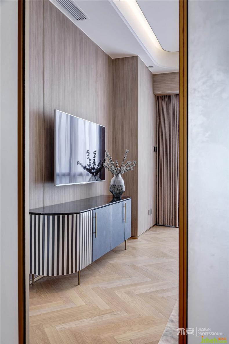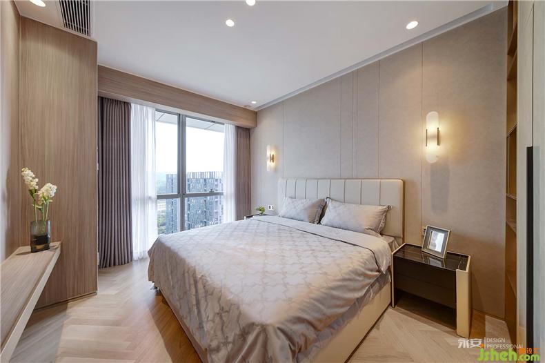 主臥設(shè)計的核心理念在于讓居者每個夜晚平和的入睡,每個清晨溫馨的蘇醒,它需要柔軟、浪漫、富有張力。室內(nèi)設(shè)計師木紋魚骨拼接地板加上木色護墻板,原木色系成為了設(shè)計師的首選,燈帶搭配筒燈的照明系統(tǒng),為主人的夜間生活提供更加舒適的柔性光源。外側(cè)的落地大窗將窗外綺麗的風(fēng)景自然引入內(nèi)部空間,同時,也成為設(shè)計師運用光影交織夢想的筆觸介體。