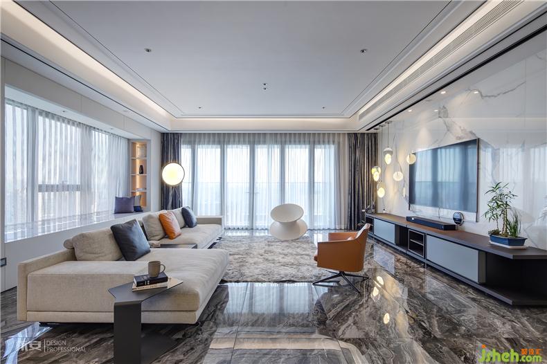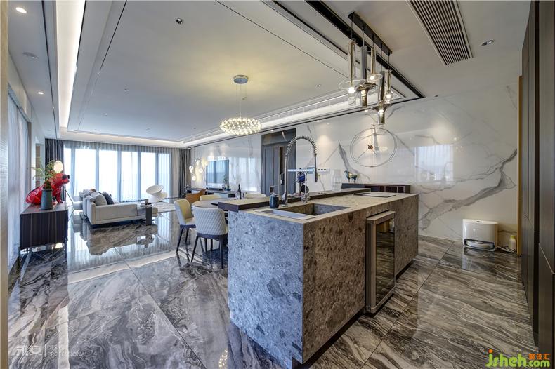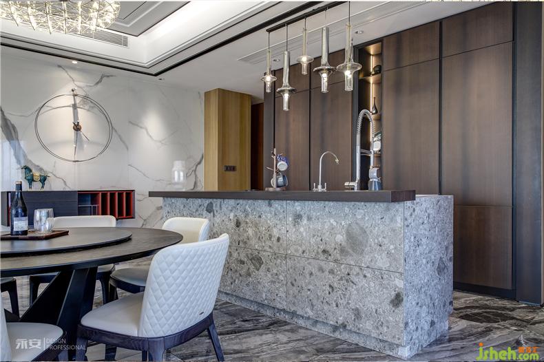 視線從客廳延伸至餐廳,以圓形餐桌為中心,格局與色彩都十分注重對(duì)稱平衡。吊燈簡(jiǎn)致而典雅,璀璨的光芒照耀下方,一切的一切都顯得秀色可餐