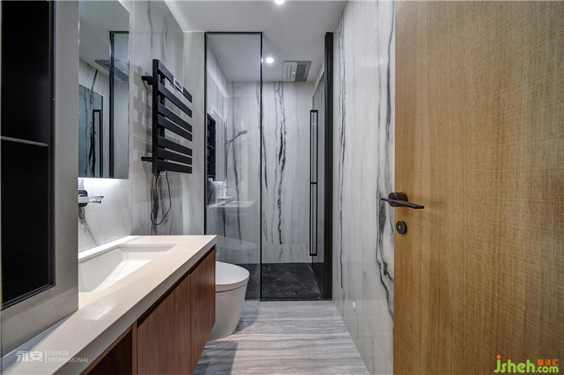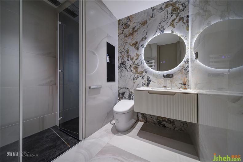 深灰色和暗金色的紋理斑駁交織,在米白色的護(hù)墻板上渲染出鬼斧神工般的自然藝術(shù),圓形鏡面之后,是集美觀與實(shí)用于一體隱藏?zé)魩?,所有的美好在它面前將無(wú)所遁形