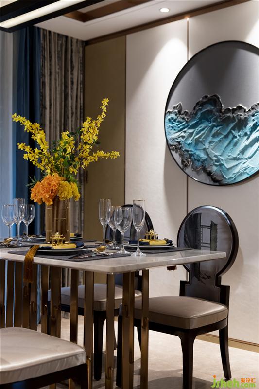 背景墻畫飾中一抹淡雅綠的點綴恰到好處,營造一個溫馨而優(yōu)雅的餐廳氛圍。