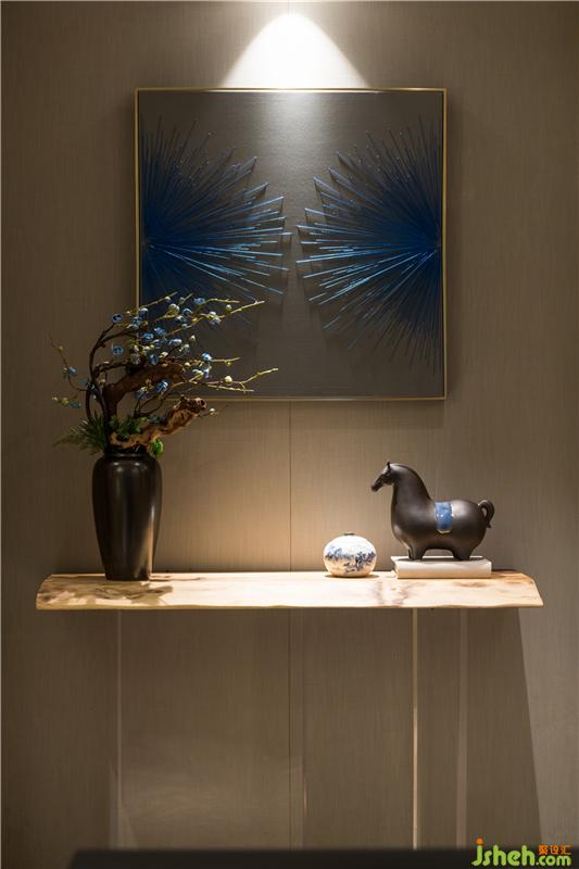 玄關(guān)設(shè)計以實木柜進行隔斷,合理劃分并充分利用空間。桔黃的燈光搖曳收藏品之間,如置身博物館般,濃郁的人文氣息彌漫周圍。