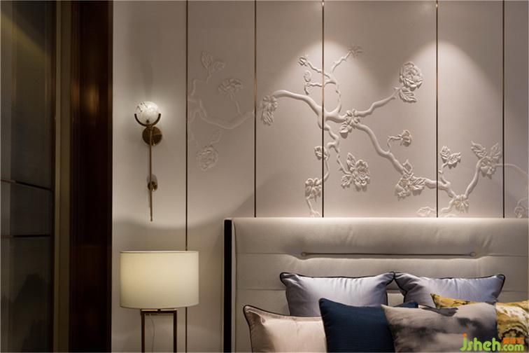 臥室床頭背景運用自然葉狀圖案皮雕,現(xiàn)代化處理,豎向分割,增加設計感。