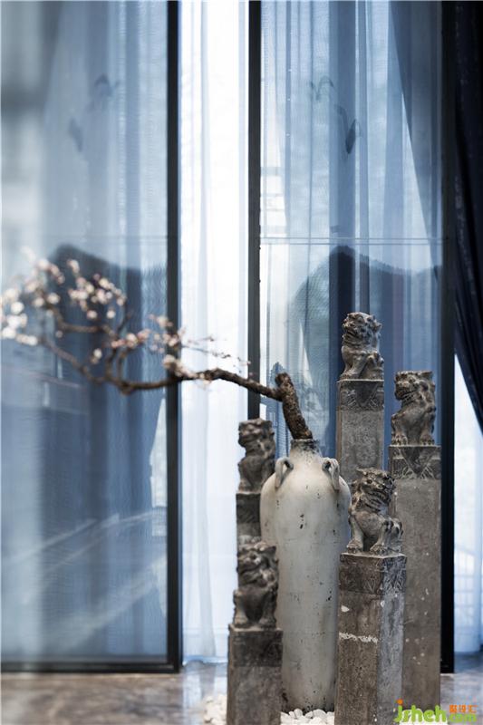 前廳,作為觀者最先步入的空間,所打造的主題在“迎”,借助迎客松山水石景觀陳設(shè),向觀者致意“歡迎”、“迎接”,同時(shí)通過古園林借景手法使前后空間相互映襯,達(dá)到隔而不斷、層次豐富的效果。