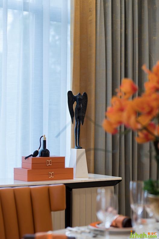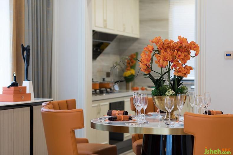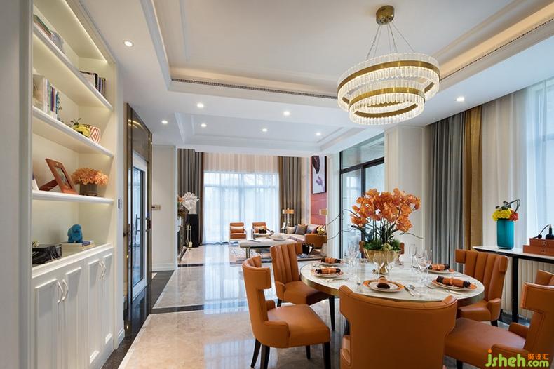 餐廳的在整體色調(diào)和材質(zhì)選擇上,與客廳相互呼應(yīng),橙色的皮革材質(zhì)椅子、香檳金圍起的大理石圓形餐桌以及豪華水晶吊燈,共同組成餐廳的主要場景。