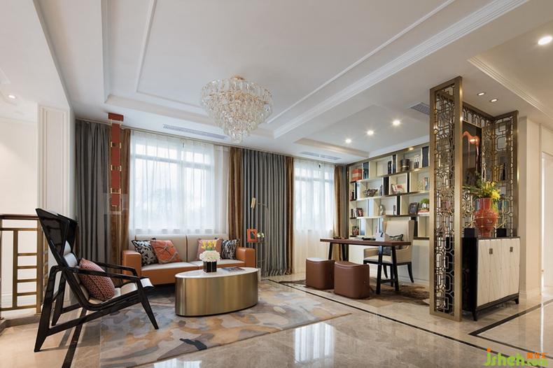 安道爾棕實(shí)木書桌和皮革面料坐凳的組合,凸顯一種時(shí)尚精致的工藝品質(zhì)感,香檳金金屬屏風(fēng)和書架邊框線條,共同勾勒出尊貴高級的空間層次感。
