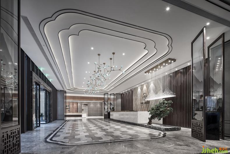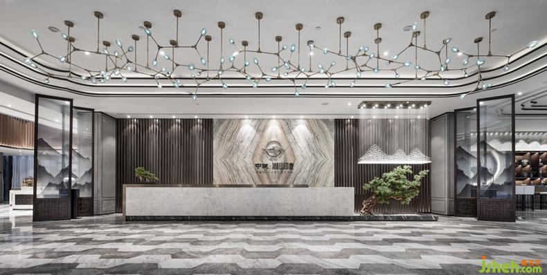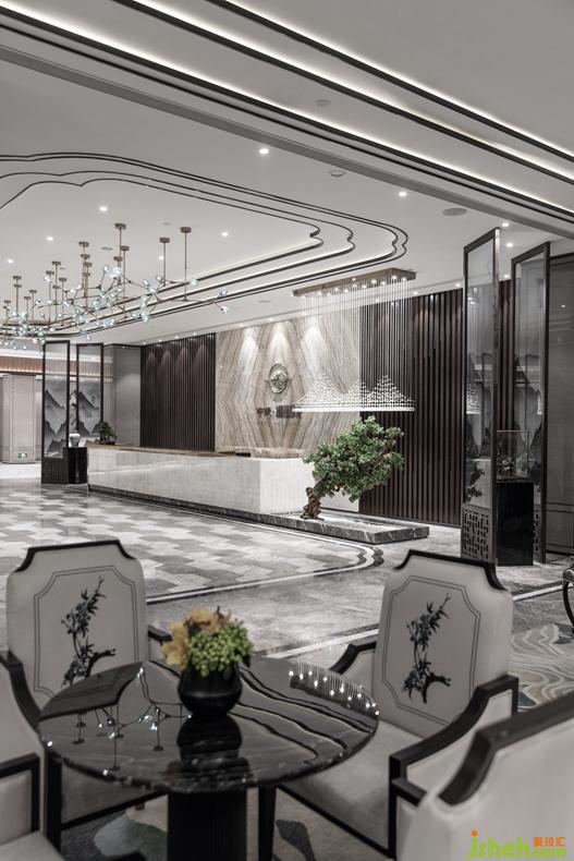 步入前廳,雅致的中式風(fēng)情和靈透的人文氣息融為一體,接待臺采用拼紋玉石背景墻面,以植物果實為元素設(shè)計的吊燈自由懸掛組合,整體空間通透大氣而不乏靈動寫意。