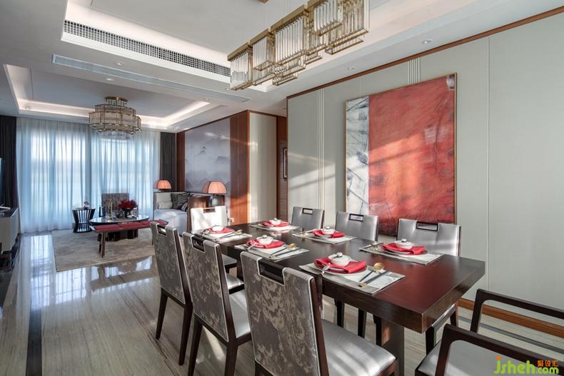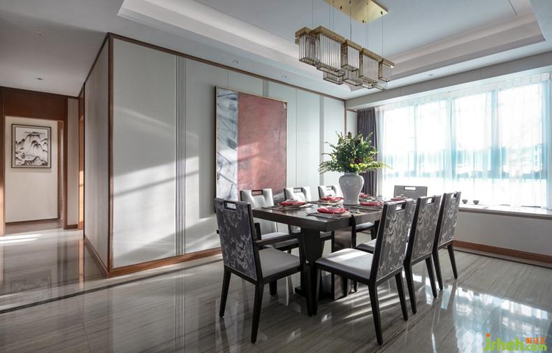 移步餐廳,墻面搭配大面積的白色皮革硬包,簡練大方,在燈光的渲染下營造出豐富的光影效果,使空間更具美感。