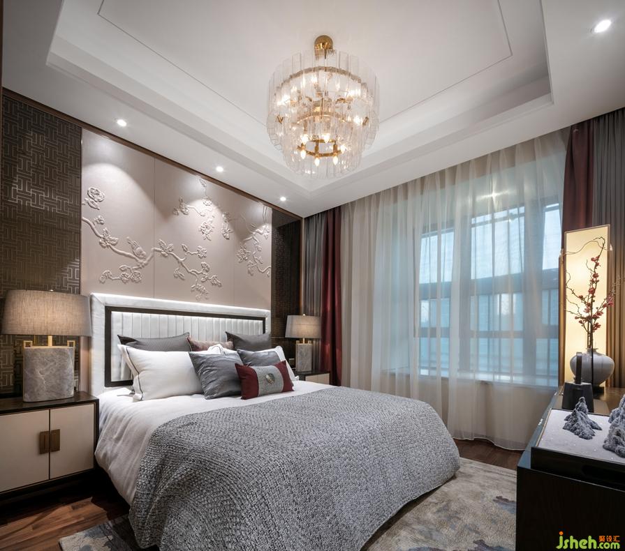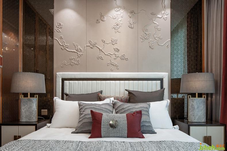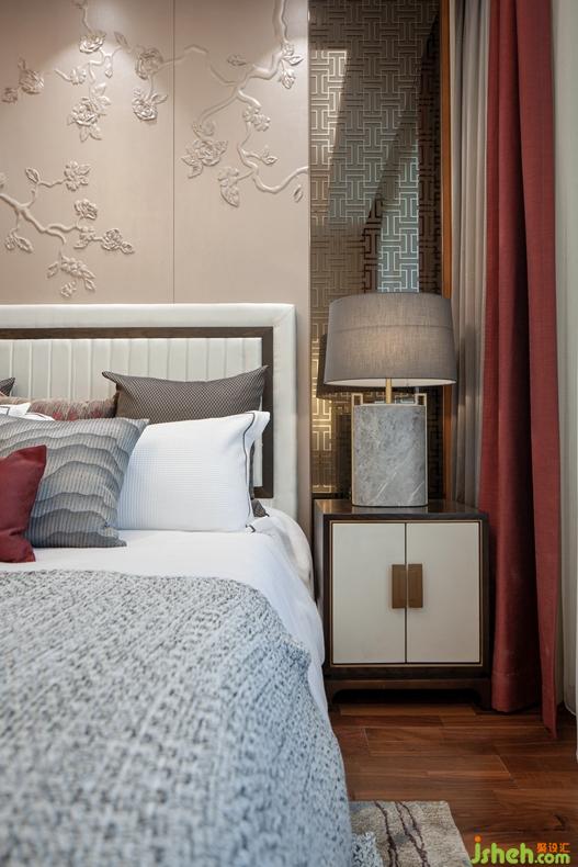 主臥床頭背景中間運(yùn)用花繪皮雕結(jié)合兩邊延續(xù)客廳花格圖案的定制藝術(shù)鏡面玻璃,體現(xiàn)空間整體性,并利用玻璃的微反射,使空間更具層次與開闊感。
