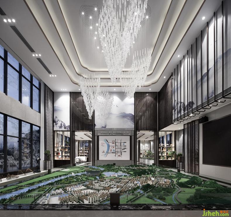 沙盤區(qū)吊燈結(jié)合仰天湖水的流動(dòng)形態(tài)及昭山的蜿蜒走勢(shì),進(jìn)行材質(zhì)與造型的選擇,強(qiáng)調(diào)項(xiàng)目的依山傍水的地理優(yōu)勢(shì),同時(shí)借助層高優(yōu)勢(shì)塑造沙盤區(qū)的視覺亮點(diǎn),優(yōu)雅而不乏儀式感。