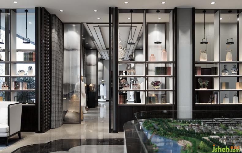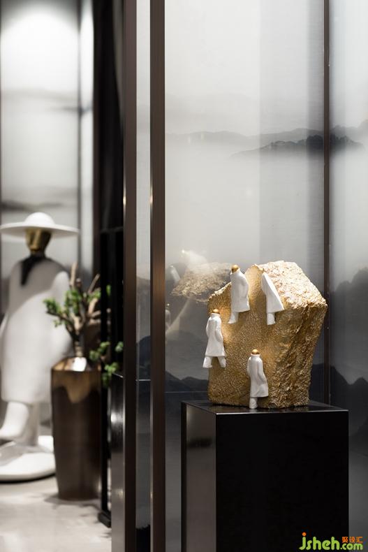 層板陳設(shè)注重疏密程度的錯(cuò)落擺放,通過古韻造景賦予空間文化底蘊(yùn)感,同時(shí)隔而不斷,打造移步換景的園林式布局。