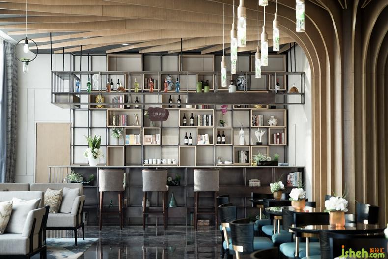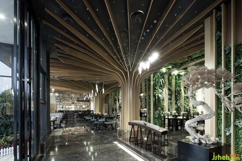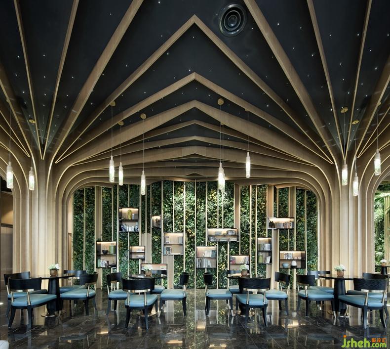 連廊另一頭是承擔(dān)本案休閑功能的咖啡書吧,放射形線條讓兩顆生態(tài)樹成為整個(gè)書吧的視覺焦點(diǎn),配合墻面綠植裝飾,意在強(qiáng)調(diào)生態(tài)自然的人居環(huán)境所帶來的輕松愜意。