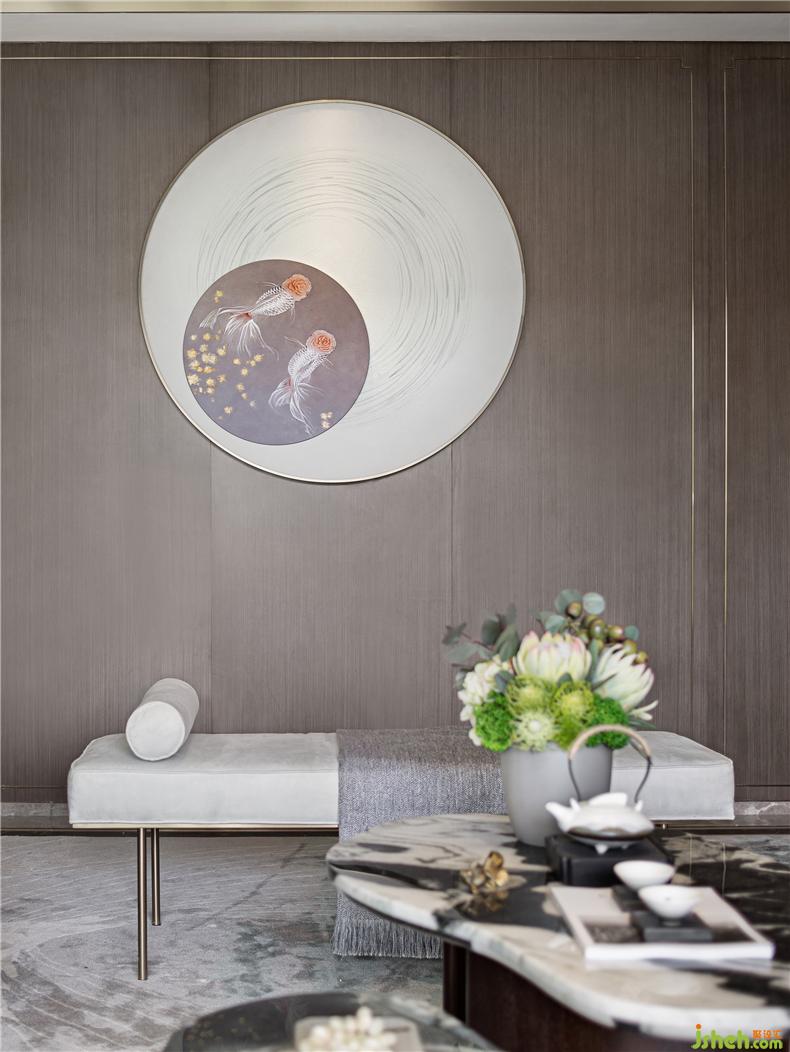兩尾錦鯉,在設(shè)計師的巧心創(chuàng)作中以游曳于空間里,穿梭于飾品擺件中“河床水藻”間,樣板房設(shè)計天然山水紋路大理石更添溫潤,組合呈現(xiàn)三維立體的視覺印象,聽著空間中帶來的輕緩國樂,是純粹細(xì)致的藝術(shù)體驗,回歸生活的本質(zhì)享受