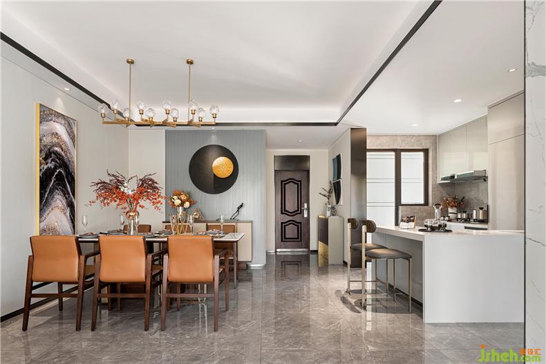 天然大理石臺面搭配具有裝飾線條感及簡約、節(jié)省空間的桌腳設(shè)計(jì),樣板房設(shè)計(jì)有助于于餐椅的擺放使用方便性