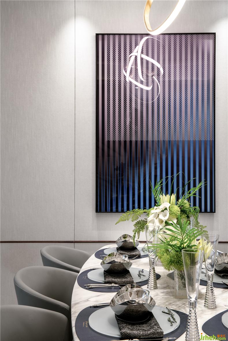 簡單、樸實、明凈是餐廳空間的代名詞,晶瑩剔透的餐具擺件映入眼簾,樣板房設(shè)計深色與淺色穿插的搭配既與空間氛圍照相輝映又與極光般的藝術(shù)燈具遙相呼應(yīng),從而達(dá)到承上啟下的渲染作用。