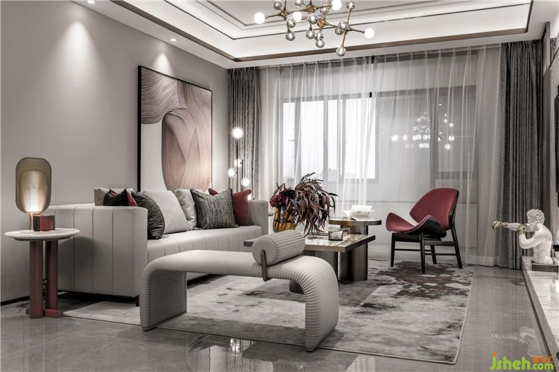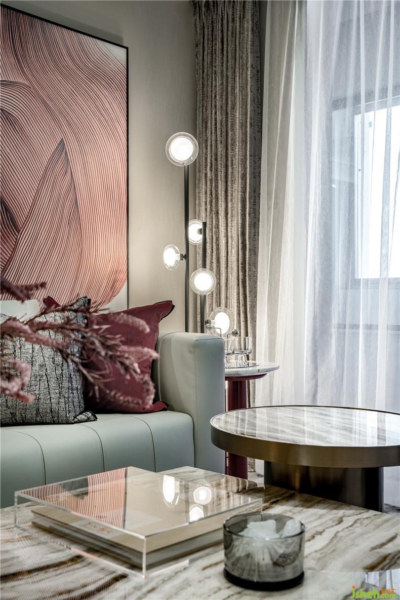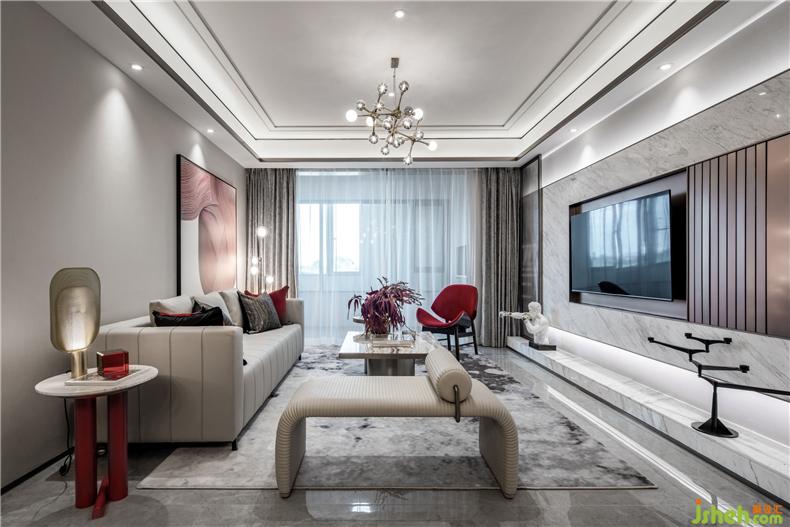 空間中石材和金屬的張力,感受利落質感,干凈冷冽的空間增添一些柔和質感。紅白用色,樣板房設計內斂雅奢;柔軟的布藝和精致的配飾達成陰陽平衡的調和。增加了底色的豐富和柔和,朱砂色元素的使用使空間多了幾分復古典雅。