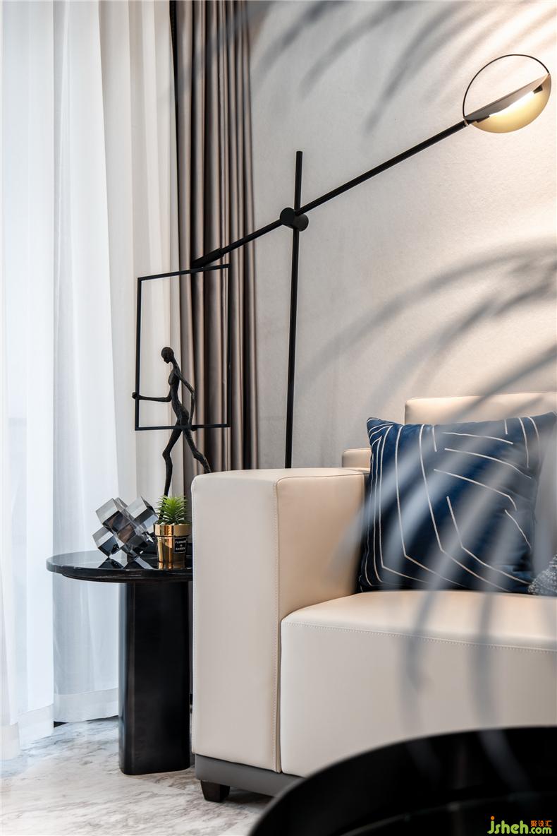 在軟裝陳設(shè)上,灰白基調(diào)配以深邃睿智的代爾夫特藍作為空間色彩跳躍,樣板房設(shè)計搭配香檳金屬材質(zhì)不銹鋼細節(jié),打造一個具現(xiàn)代臻品的迷人空間。