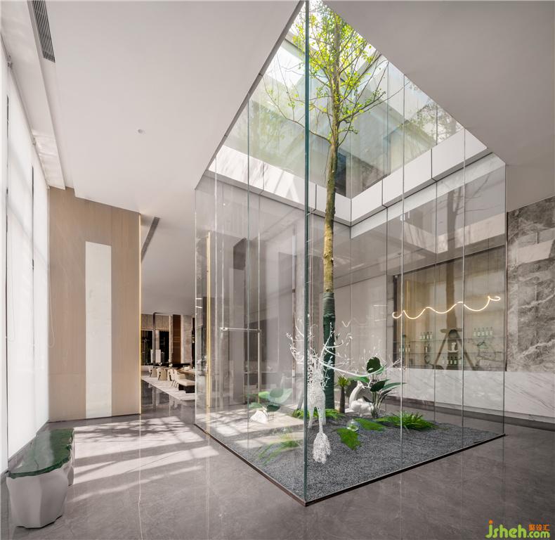 代表生機的綠色讓空間節(jié)奏跳躍,一旁置放著玻璃鋼與手工樹脂制作的科技琥珀長凳,營銷中心設計打破大空間的沉悶,提取低飽和的森林色彩,搭配動物與植物的形象提取、元素組合,自然柔和,舒適干凈