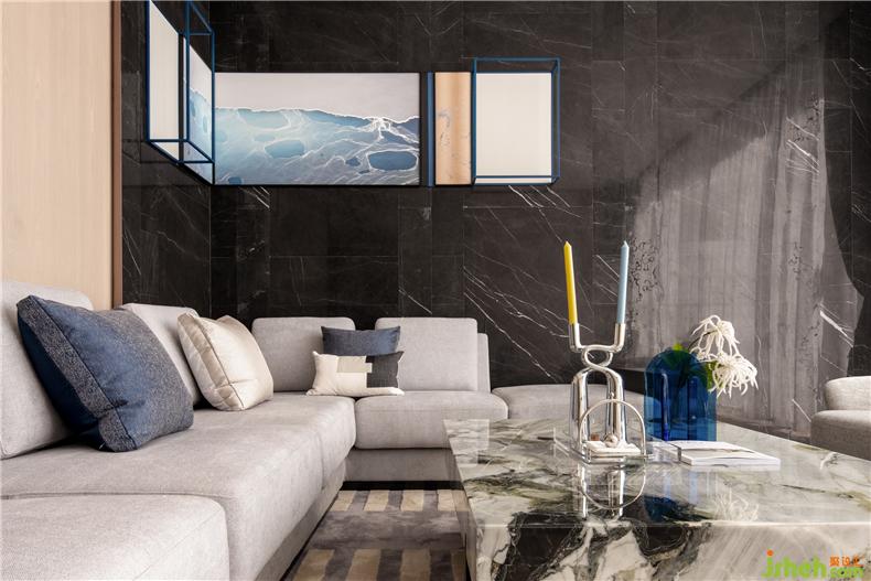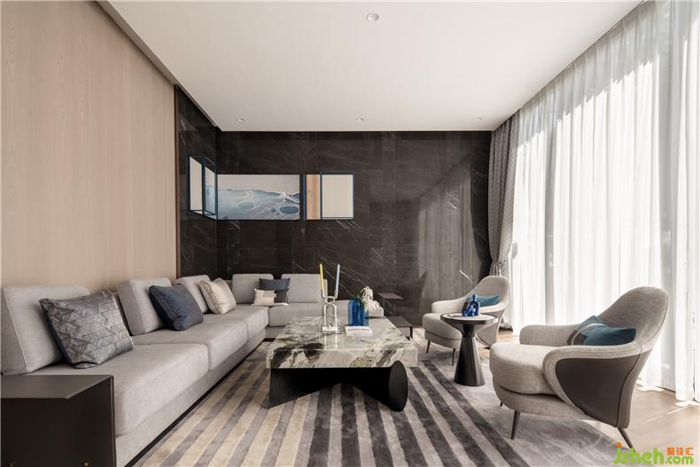 Vip洽談室以木色、深灰作為基地,用優(yōu)雅的藍色點綴豐盈空間,轉角立體掛畫,對應著轉角沙發(fā),賦予情感色彩,在柔軟中美麗、自然而浪漫