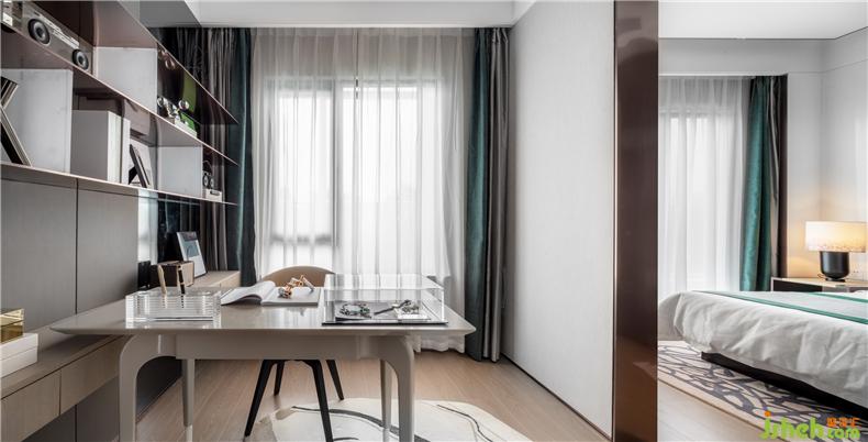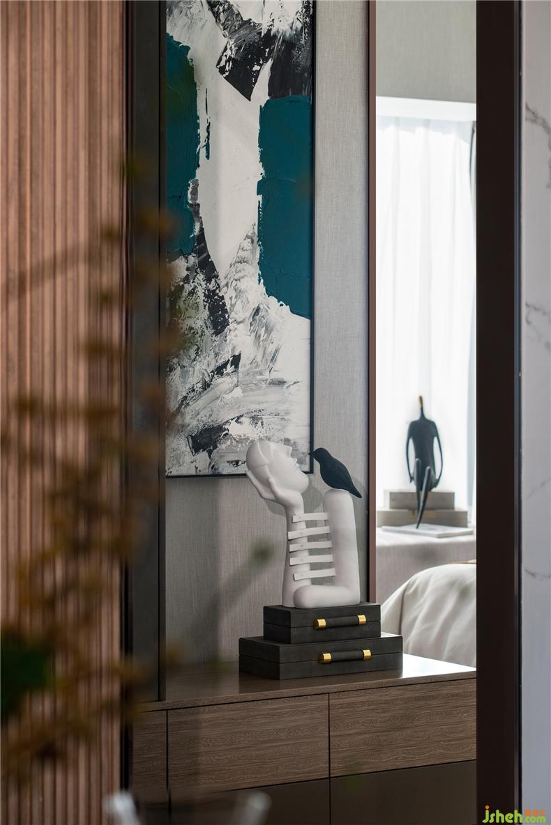 次臥進(jìn)門處以衣柜作為遮擋,以塊面與線條的和諧搭配,以平和的材質(zhì)色彩,營造出沉謐簡寧的整體氛圍。
