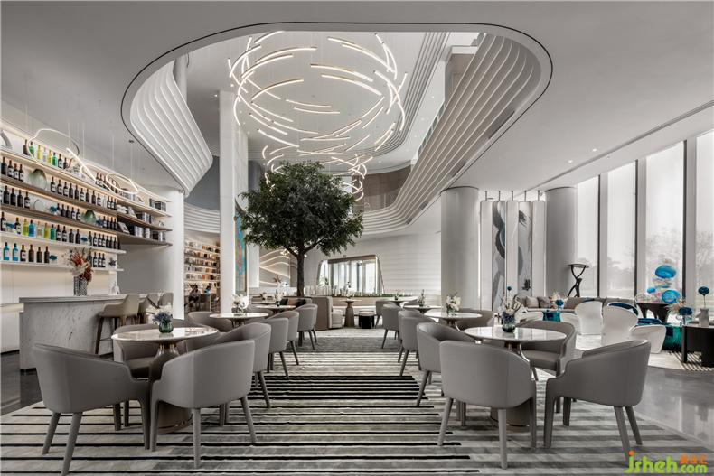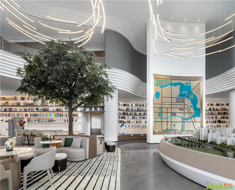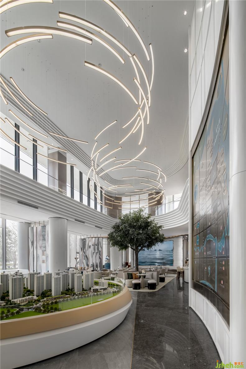 銜接一二層之間的是一盞巨大的藝術(shù)吊燈,橫貫洽談區(qū),以水波紋為設(shè)計(jì)靈感,用藝術(shù)的手法,抽象的表現(xiàn)水流形態(tài),給人留下視覺震撼。以水便以水為媒介,藉由自然光影與建材紋理, 捕捉水波的藝術(shù)姿態(tài),注入設(shè)計(jì)理念, 并將其貫穿在空間當(dāng)中,讓人留住當(dāng)?shù)氐乃洃洝?