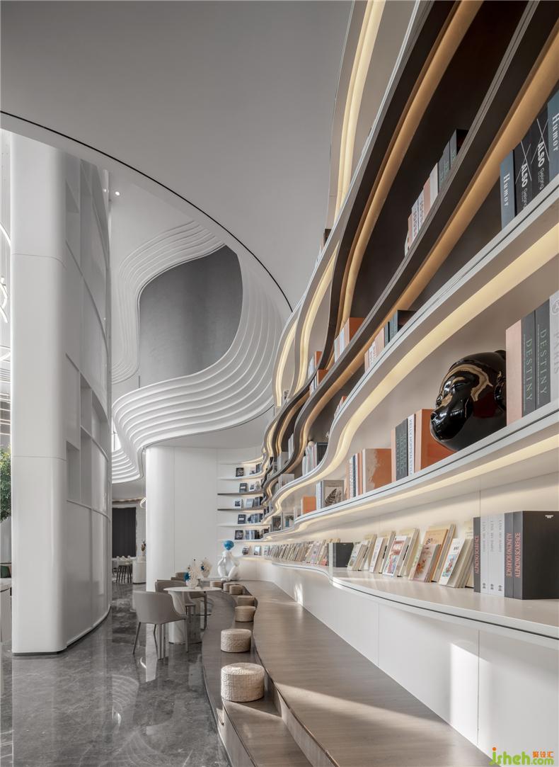 書吧的書墻采用流線型的波紋設(shè)計(jì),層層綽約的書架讓人仿佛置身于海浪波濤之中,與整體水文化設(shè)計(jì)呼應(yīng),悠遠(yuǎn)寧靜,絢麗多彩的的設(shè)計(jì)更是為整體空間增添了一抹暖色,舒適宜人。