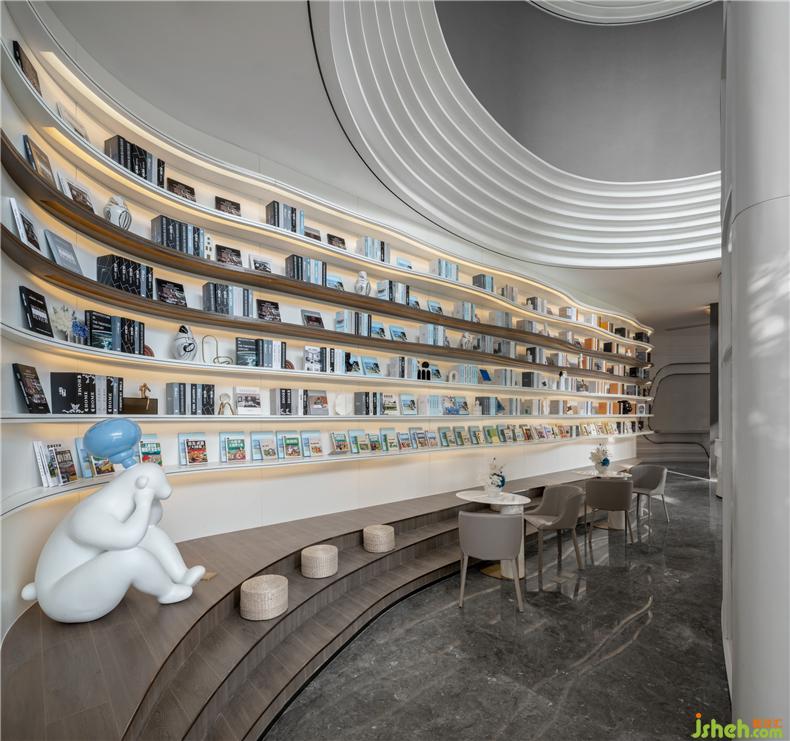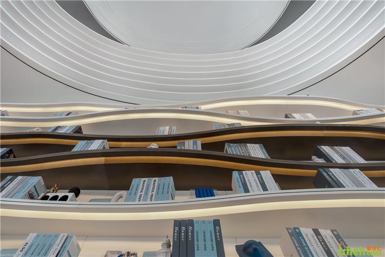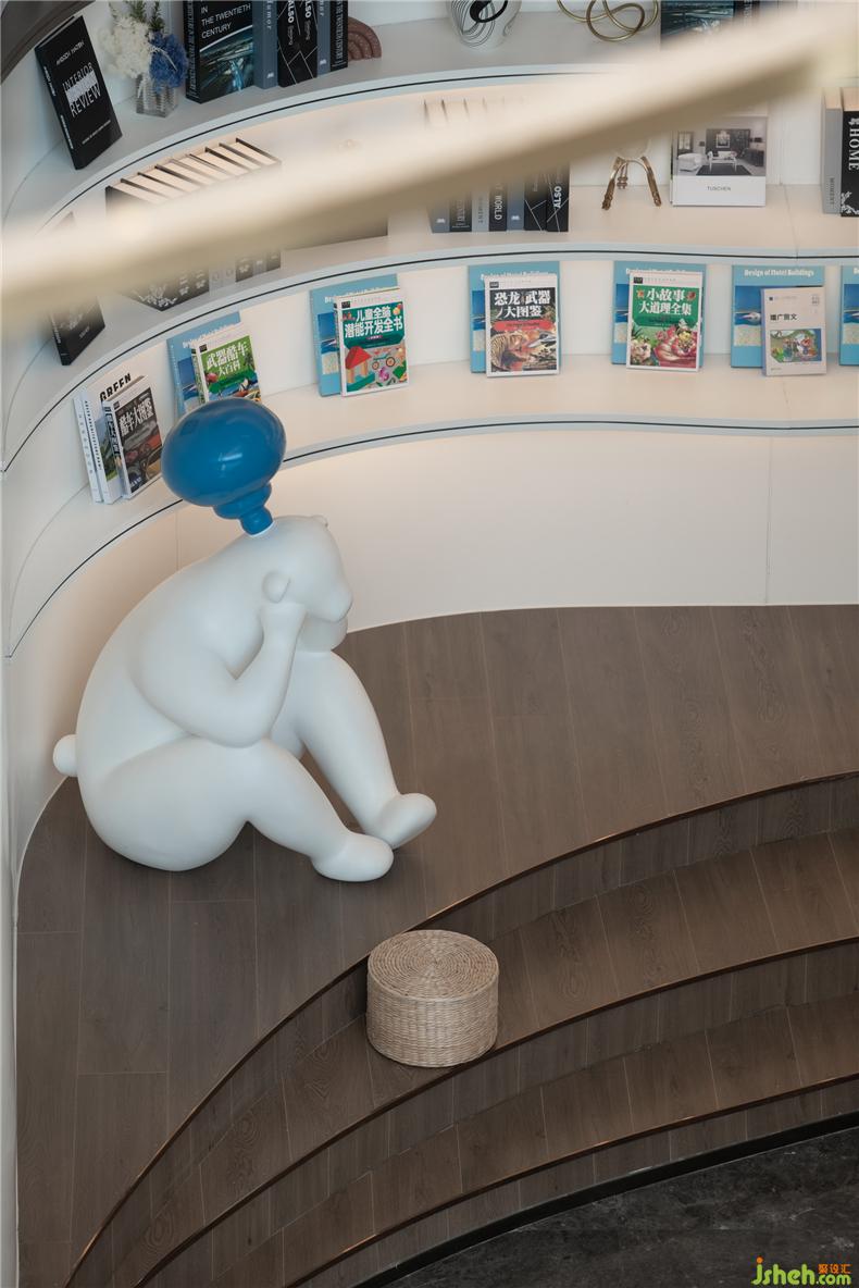書吧空間都是開放式的,在書墻的下方還有同樣波紋形狀的可入座臺(tái)階,供閱讀者稍作休憩,拉近人與人之間的距離。在臺(tái)階的一側(cè)更是矗立著一個(gè)活潑可愛的卡通小熊IP裝置,讓不管是成人還是孩童都能在書吧享受到逃離都市喧囂的片刻寧?kù)o。