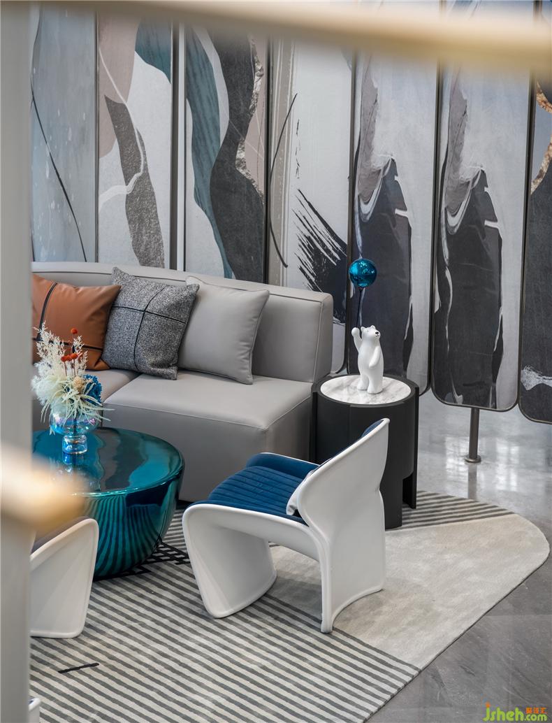 亞克力材質(zhì)的泡沫裝置工藝繁復(fù),光澤透亮,充滿現(xiàn)代感,讓人仿佛置身于充滿夢(mèng)幻色彩的湖泊海洋,營(yíng)銷中心設(shè)計(jì)滿室旖旎。沙發(fā)一側(cè)的小型藝術(shù)裝置,是空間的雕塑感的延伸,充滿了寧?kù)o獨(dú)特的氣質(zhì),與整個(gè)空間融合,產(chǎn)生一系列微妙的變化。