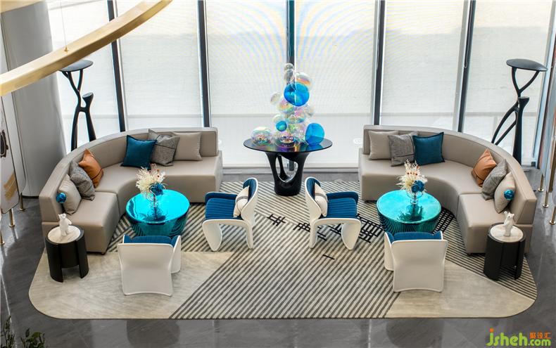 炫彩玻璃鋼茶幾是整個(gè)深度洽談區(qū)的重點(diǎn),夢(mèng)幻如泡沫的立體裝飾雕塑更是整個(gè)空間的重心,左右兩側(cè)是對(duì)稱的沙發(fā)桌椅,空間和諧柔美又不失高級(jí)。