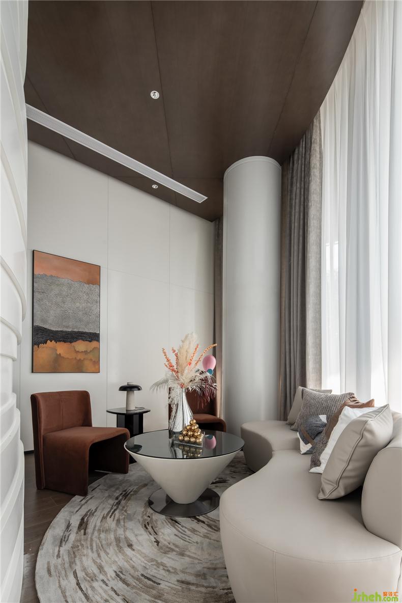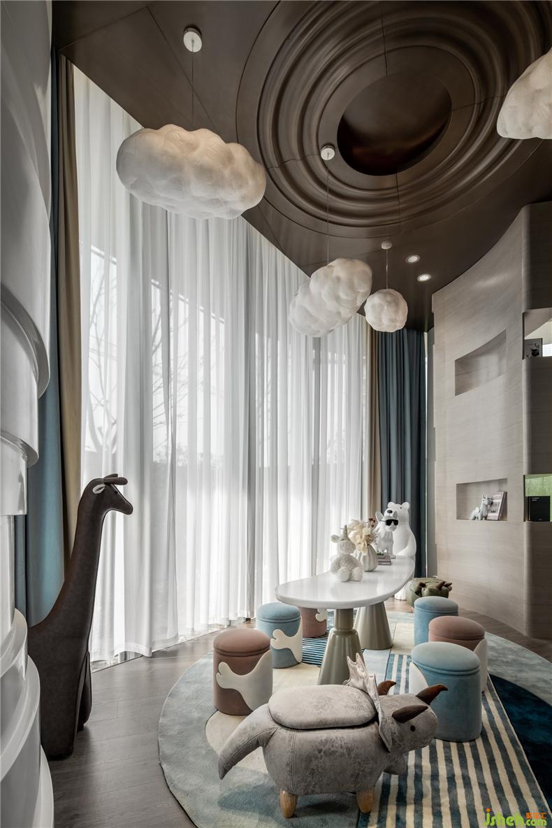 以動物為主題的兒童區(qū),色彩豐盈,童真童趣,體現(xiàn)出空間的層次感。天花板上垂落的白云燈是自然生態(tài)的體現(xiàn);隨處可見的動物裝飾活潑可愛;以閱讀和手工為主的臺面柔和純凈;可儲物的座椅以及再次出現(xiàn)的卡通小熊IP,營銷中心設計兒童區(qū)所有的元素集合能讓家長放心的讓孩童在此享受到愉快的時光。