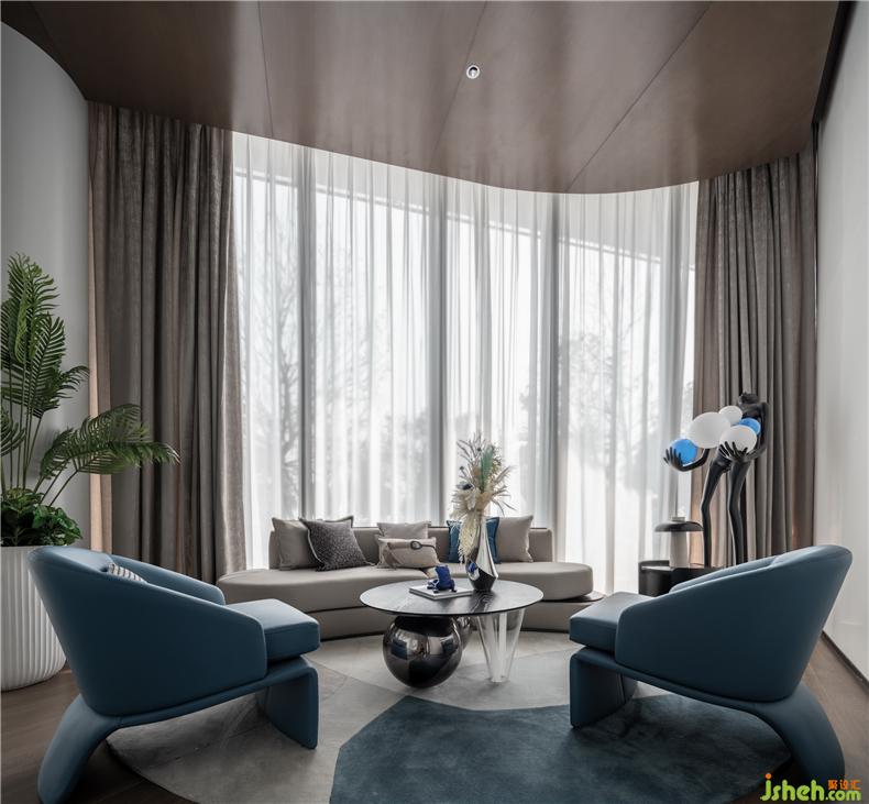 以藍(lán)色為主的VIP室,沉穩(wěn)大方,讓置身其中的人能享受到安逸的談話氣氛,充盈幾何感的的茶幾與現(xiàn)代感單位沙發(fā)結(jié)合為空間增添了時尚感,網(wǎng)紅藝術(shù)落地?zé)舸钆淞Ⅲw木雕裝飾畫為空間增添了活躍感,置于桌面的藝術(shù)炫彩花瓶折射空間的色彩,營銷中心設(shè)計更是其中的點睛之筆,大氣美觀。