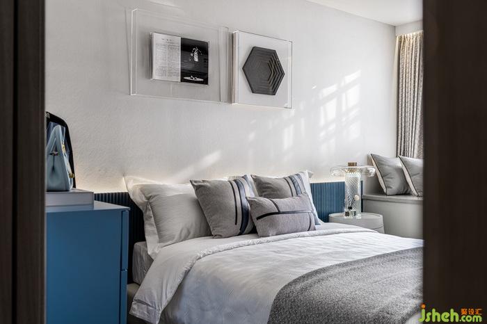 客廳與餐廳的幾何線條與色彩搭配,不動(dòng)聲色的延展到了臥室里。樣板房設(shè)計(jì)客臥的空間雅致大方,在這個(gè)隱匿舒適的空間里,不需要過多裝飾,除繁就簡,足以過濾所有的倦意。
