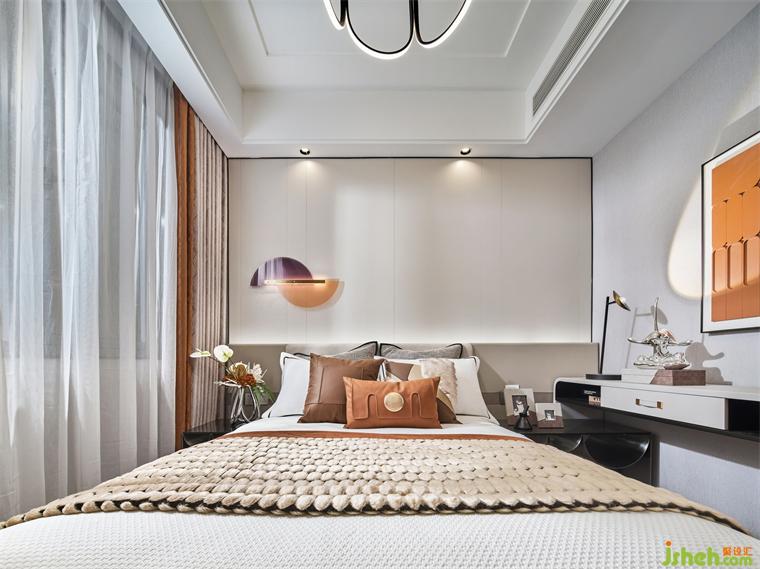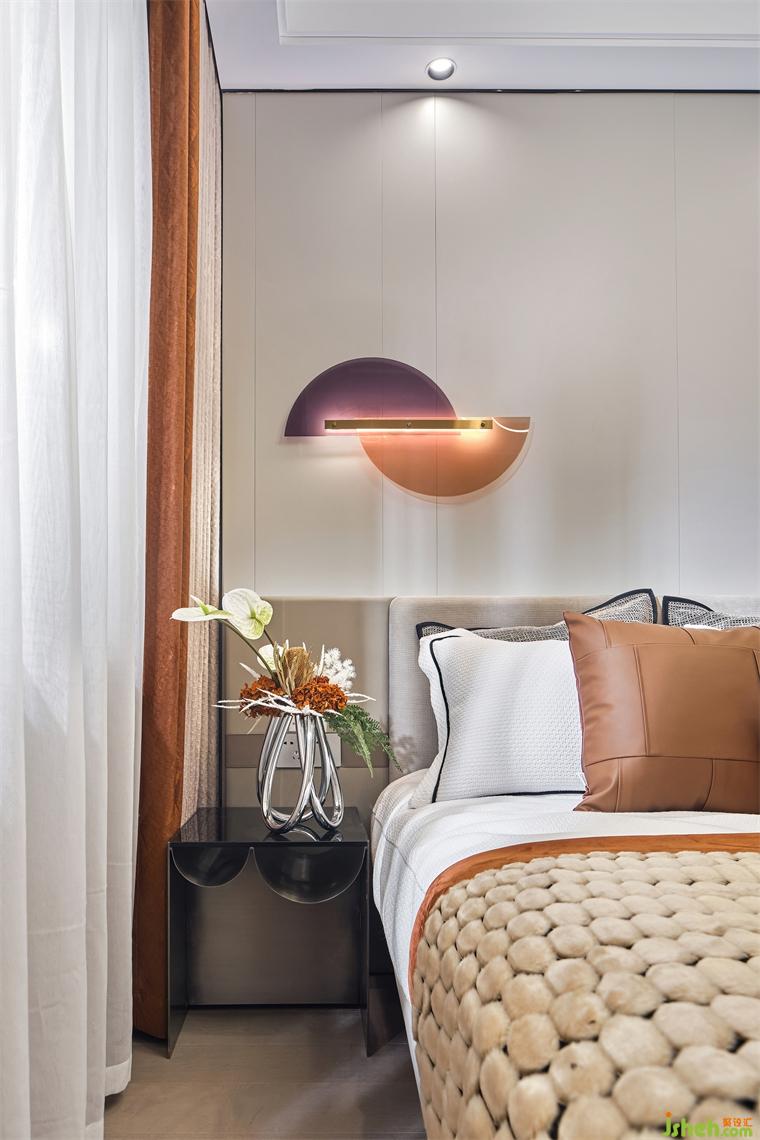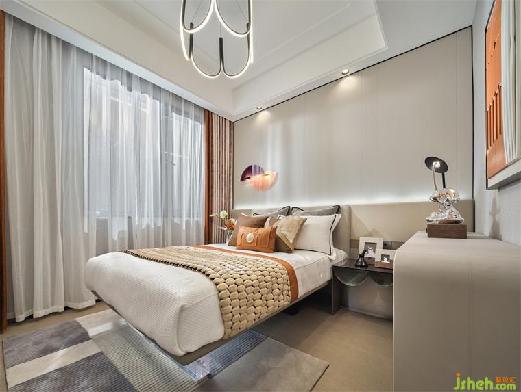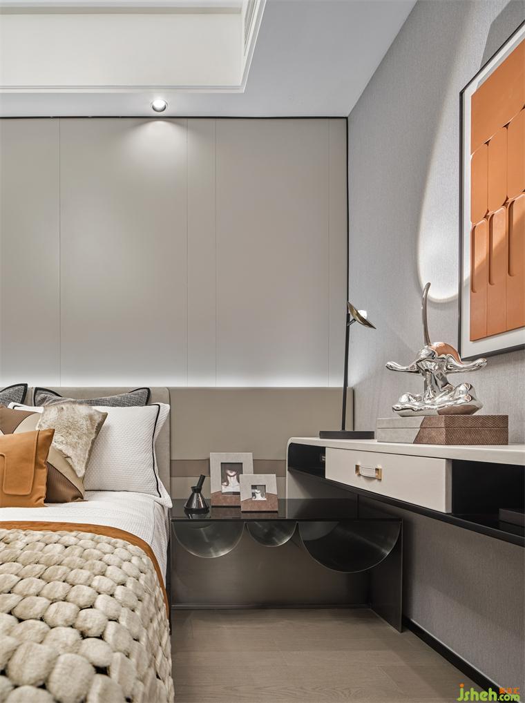 設計師在次臥的設計上,簡約而又不失創(chuàng)造力和對實際需求的細致考慮,樣板房設計使用漂浮床的設計,更好的把空間融為一體,而床頭靠背與床頭柜、邊柜相連,充分利用了空間,軟飾的配色予以不同層次的橙,加了空間層次感。