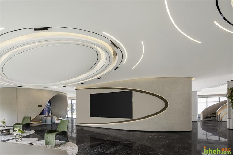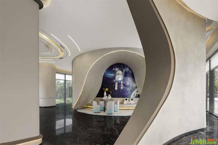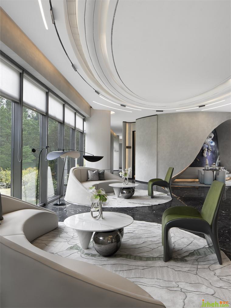 乳白的異形沙發(fā)、灰綠色的單人椅、售樓處設(shè)計淺色的大理石臺面圓桌與地毯,一切都是那么和諧柔美,讓人的身心似乎也得到了放松。