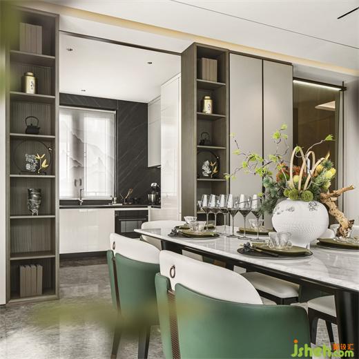 餐廳與客廳視覺平坦開闊,廚房通透與私密性隨意切換,讓空間視野更加通亮。別墅軟裝設計餐廳餐桌采用大理石臺面,高低錯亂的現代設計語言,展現行云流水的優(yōu)雅尺度。