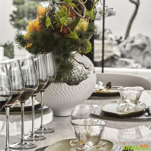 當陽光透過紗簾均勻柔和地鋪在餐廳里,家人圍坐于餐桌前,別墅軟裝設計花藝點綴三餐四季的溫馨氣息,天然石材的紋理與高級灰的結合,跳脫出盎然生機的翠色,沉穩(wěn)內斂的皮質餐椅,襯得整個空間的精致感油然而生。