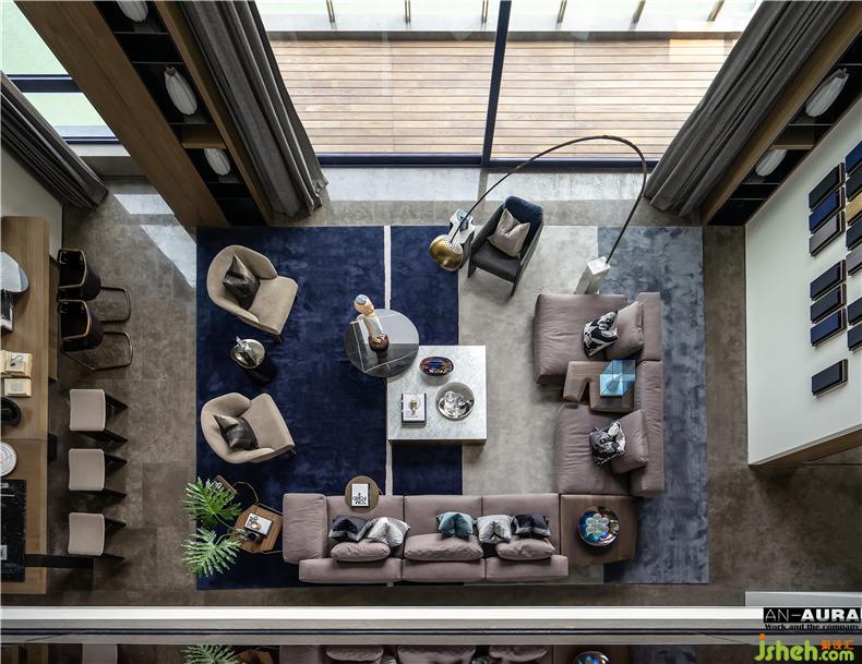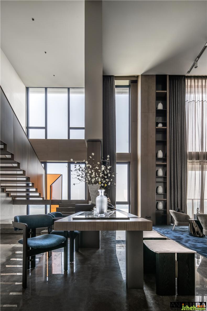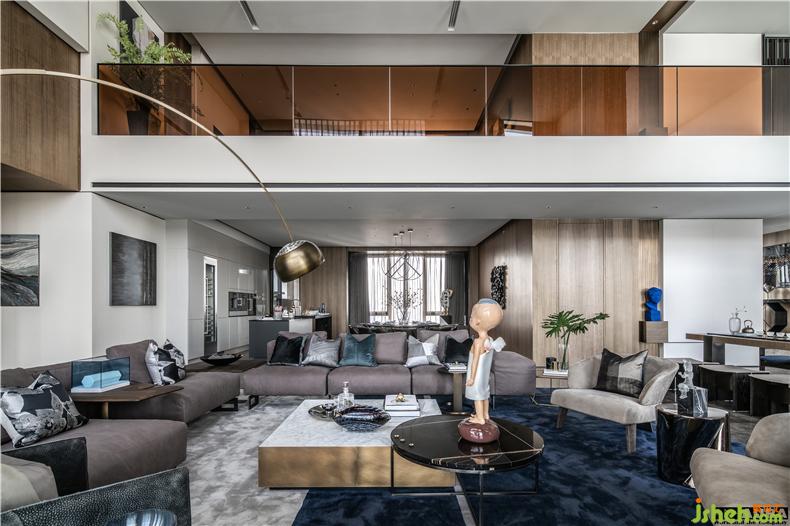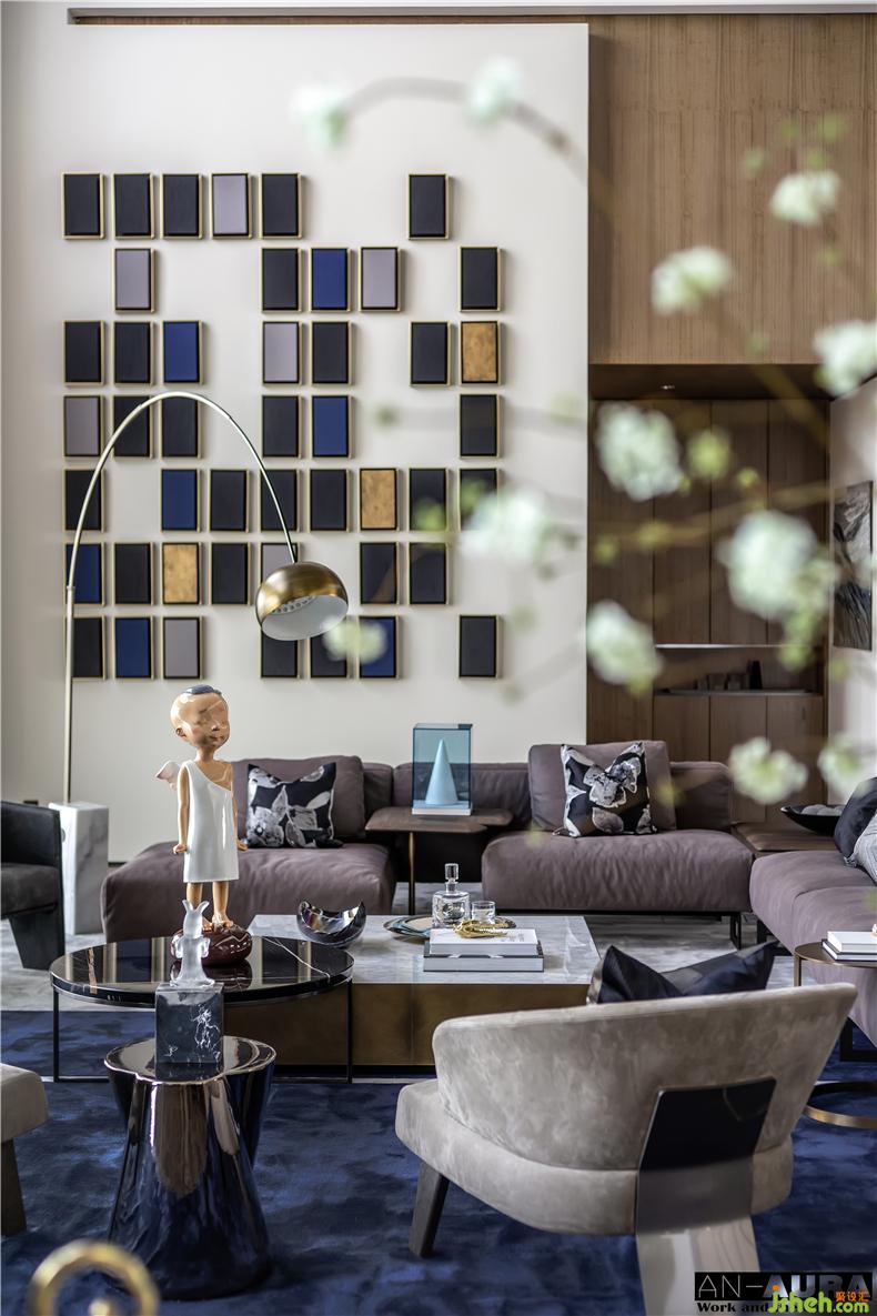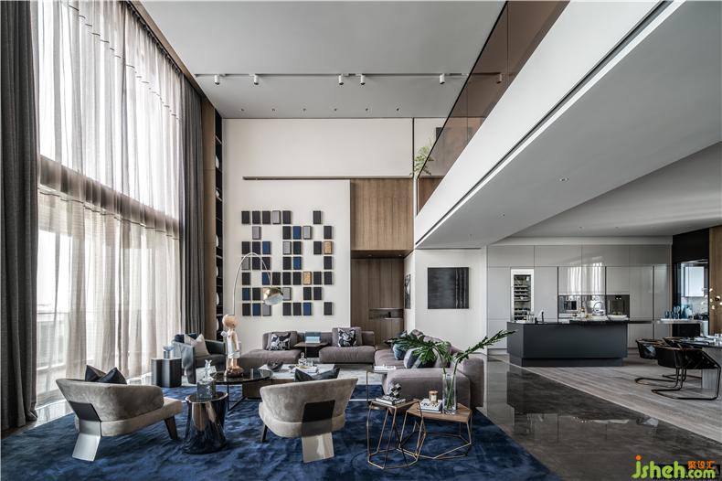 步入客廳,便是另一方天地,雙層挑高高度采用大幅的落地窗設計,組合的藝術畫作拉伸了空間的縱深感,引入自然光,大理石紋的Meridiani茶幾、低飽和度的意大利Henge沙發(fā)及單人椅,樣板房設計再融入Minotti的休閑椅顯得低調(diào)而純粹,在滿足使用需求的同時增加空間的通透性。