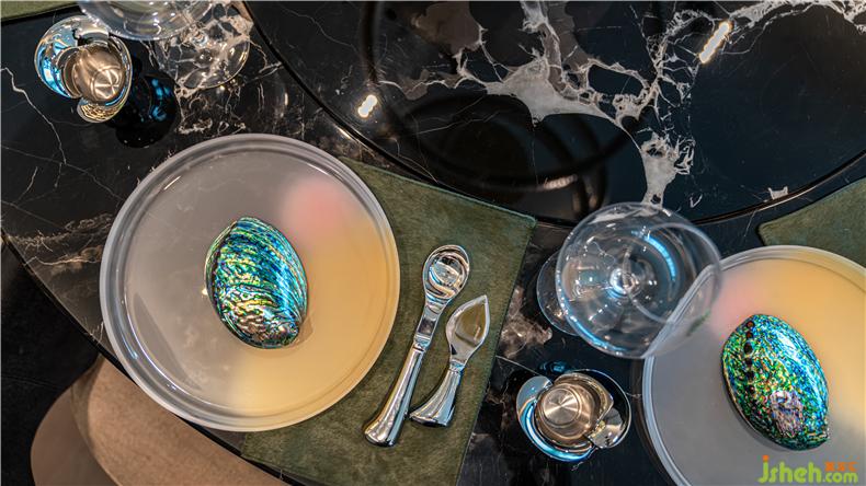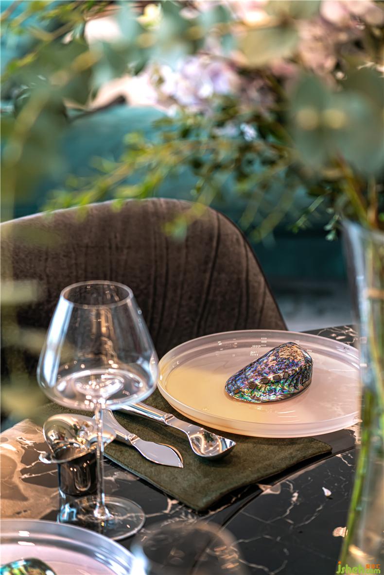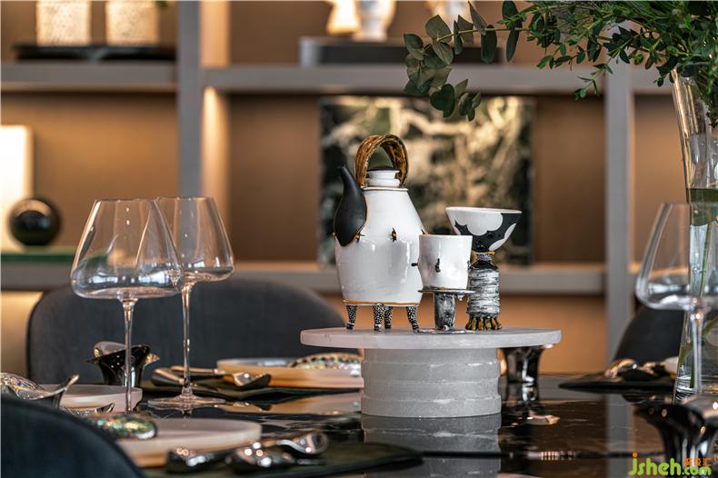 餐臺(tái)上放置的Studio Formafantasma手工制作餐盤,經(jīng)由乳白色材料吹制出彩色無定形色彩的顏料,質(zhì)地輕透如霧,每件都有獨(dú)特的肌理。桌子上的瓷壺和酒壺也是藝術(shù)家制作的。它們是獨(dú)一無二的手工制品,充滿了創(chuàng)造力和對(duì)生活的興趣。