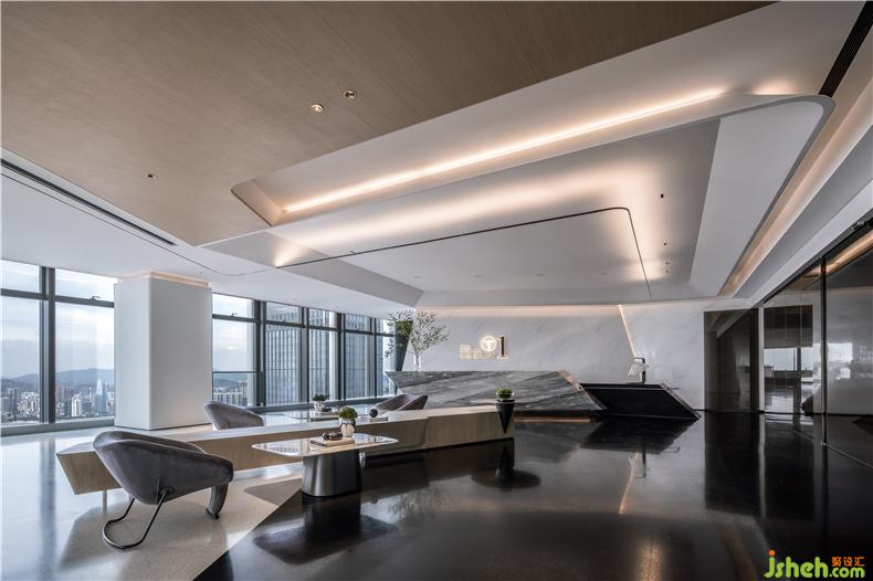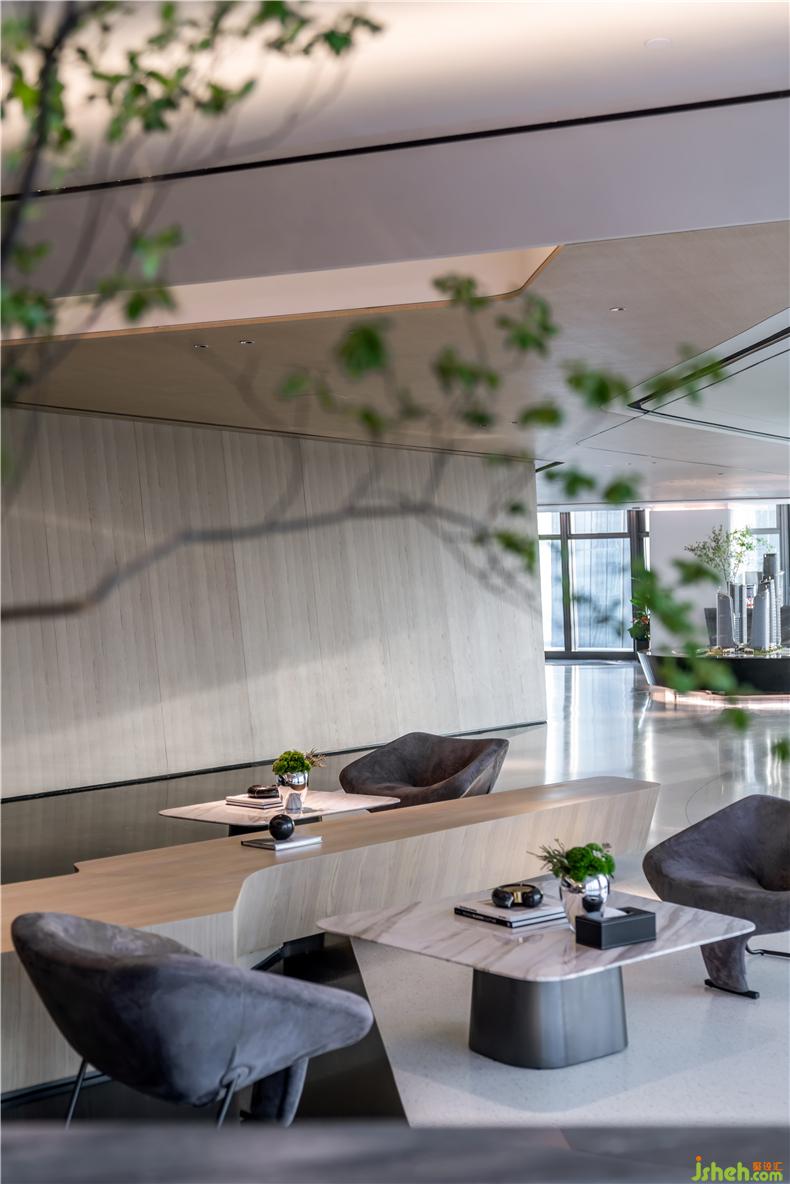 經(jīng)由接待前廳,先是進(jìn)入多媒體影音區(qū)。半圓型設(shè)計,線條簡潔,動線流暢,辦公室設(shè)計彰顯科技與時尚的設(shè)計感?;⌒尾Aγ娓舫霭雵鲜焦δ芊謪^(qū),內(nèi)外視野延伸,采光通透,還可以智能調(diào)節(jié)明暗,播放影音視頻時,玻璃墻會變成霧化磨砂質(zhì)地,增添空間私密性;弧形長條坐凳相得益彰,白色水磨石材基座與磨砂真皮坐墊組合,簡約之中不失型格氣質(zhì)。