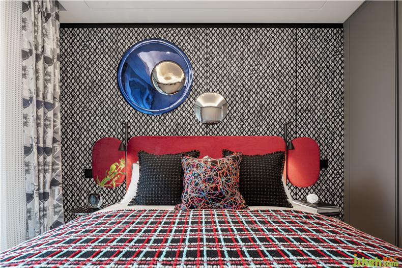 另一套次臥采用紅藍(lán)撞色設(shè)計,熱情與平靜的碰撞釋放愉悅活力之感。樣板房設(shè)計圓滑流暢的弧線散布于床頭柜、掛飾、床邊柜、燈飾,流動而溫柔的藝術(shù)線條完美勾勒出生活的舒適安逸。