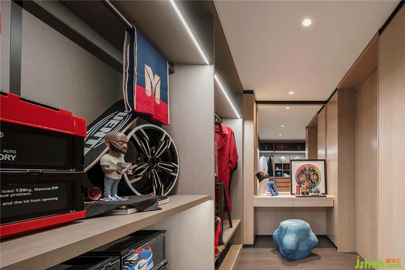 新貴們都是資深的‘時尚客’。他們對衣裝絕不盲從,自有一套審美,與此同時,他們的時尚品位又絕不限于衣服鞋品,各類潮流手辦亦是當(dāng)代都會新貴的必收藏品。 設(shè)計師將一間大尺度的步入式衣帽間打造成多功能收納空間,不僅是時裝廊,也是都會潮流‘玩家’的手辦收藏室,靜心貯藏的服飾與藏品,陳列規(guī)整,便于挑選與鑒賞。