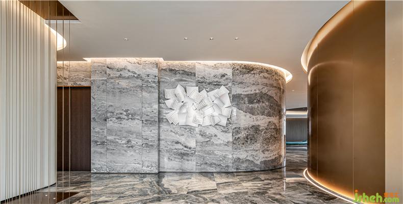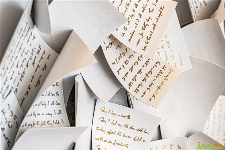 會議室與影音室一側(cè)的墻面上,設計師放置了一組辦公便簽/文件主題的金屬材質(zhì)藝術(shù)掛飾。畫面為一組寫著字跡的紙張,像被風吹過散落一地的感覺,又像是辦公室頭腦風暴留下的文件,飛揚起來被定格的一幕,辦公室設計藝術(shù)家將其融入藝術(shù)創(chuàng)作,再現(xiàn)工作氛圍中當下的永恒瞬間。
