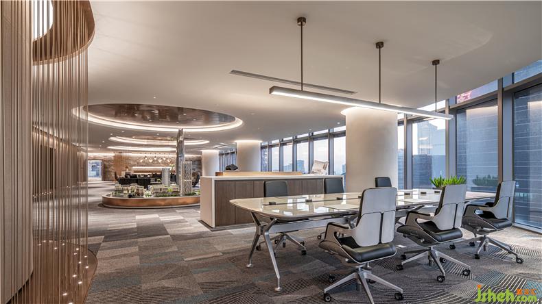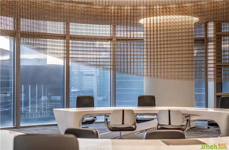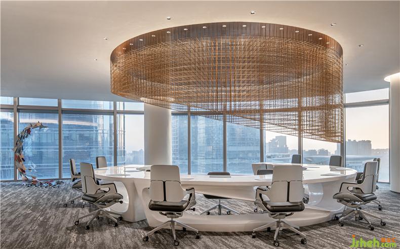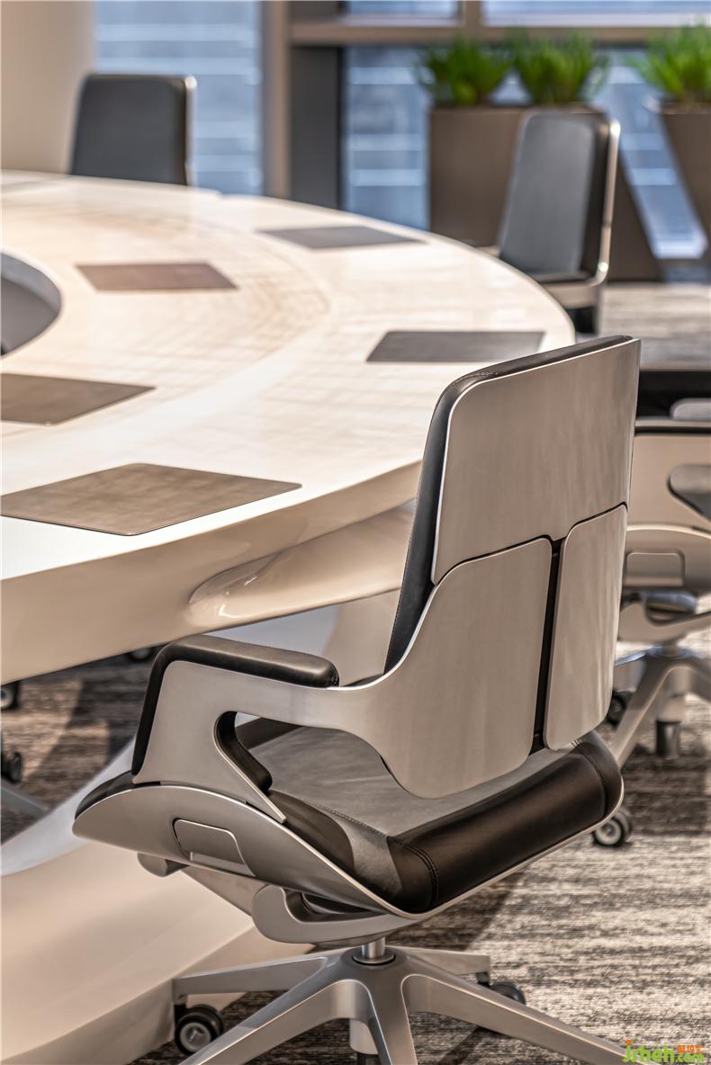 改變傳統(tǒng)的辦公空間布局,開放式辦公展示區(qū)以圓形空間主導,白色玻璃鋼材質(zhì)的圓桌,以及銀色德國制造鋼板手扶辦公椅,造型前衛(wèi),充滿未來感,頂部螺旋狀弧形金屬罩造型,宛如宇宙星云環(huán)繞,與弧形辦公桌上下呼應,如太空艙主控臺一般,形成一個聚合能量場。