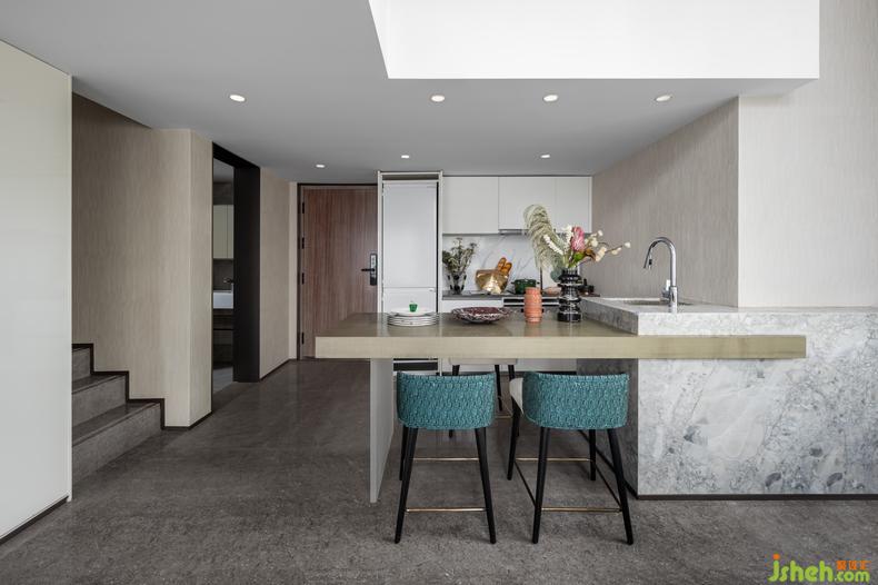 餐廚空間以簡(jiǎn)約之風(fēng)構(gòu)造出別具一格的舒適體驗(yàn)樣板房設(shè)計(jì)。開放式廚房將吧臺(tái)與廚房結(jié)合,最大化節(jié)省空間的同時(shí)做到擴(kuò)大空間感,增大客廳效果。幾點(diǎn)翠綠穿插交疊,花束生動(dòng)十足,溫馨自然的雅韻之氣在空間蜿蜒綿亙。